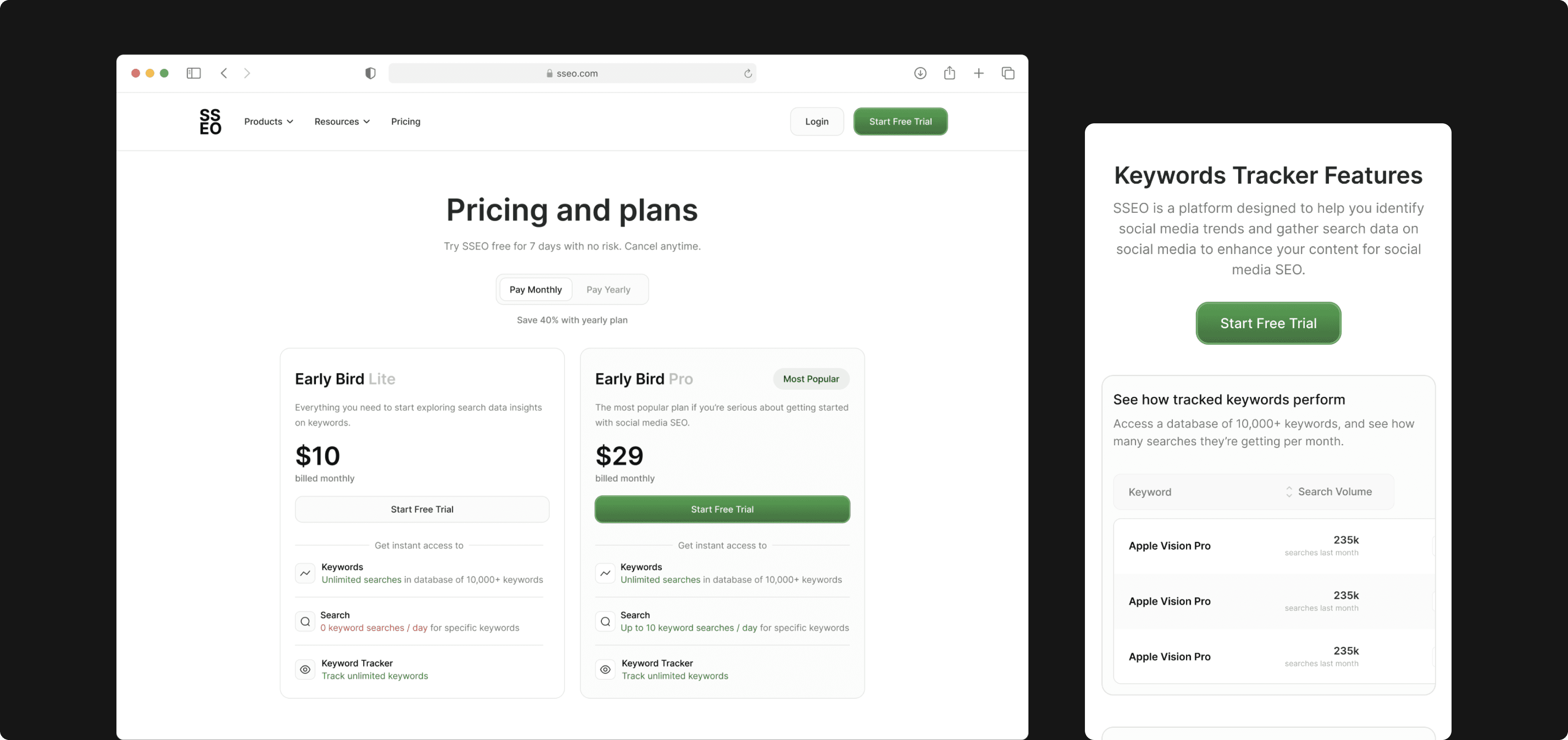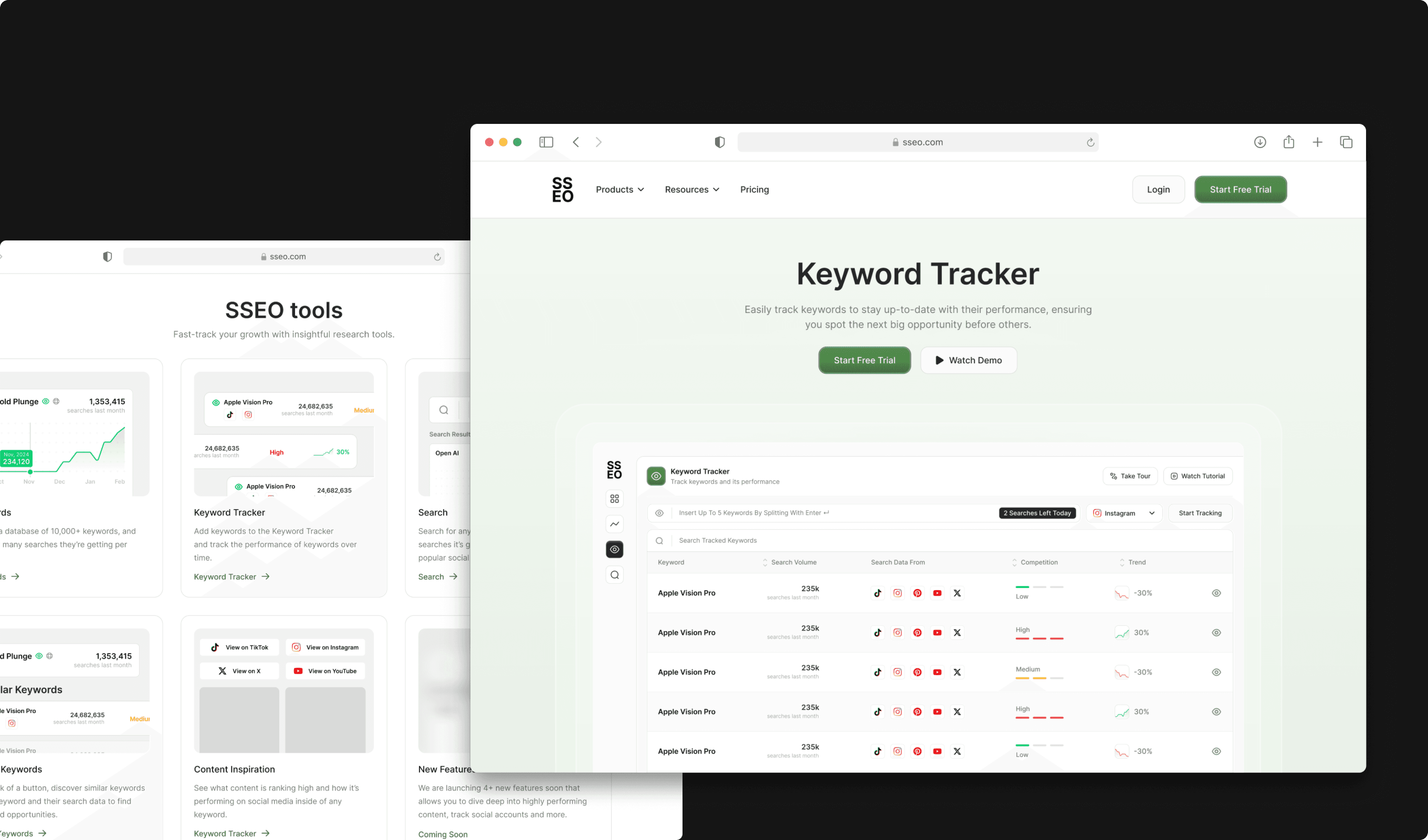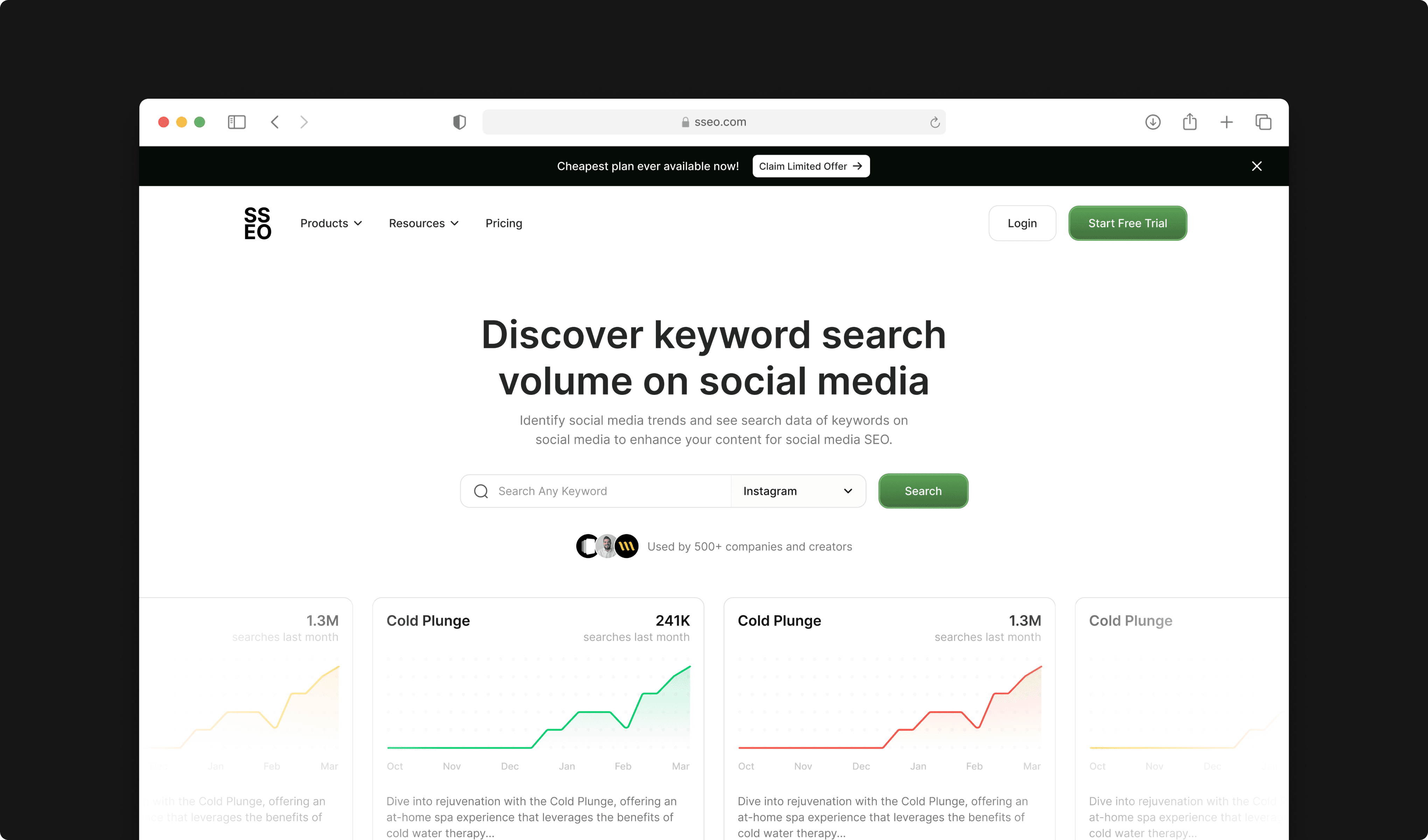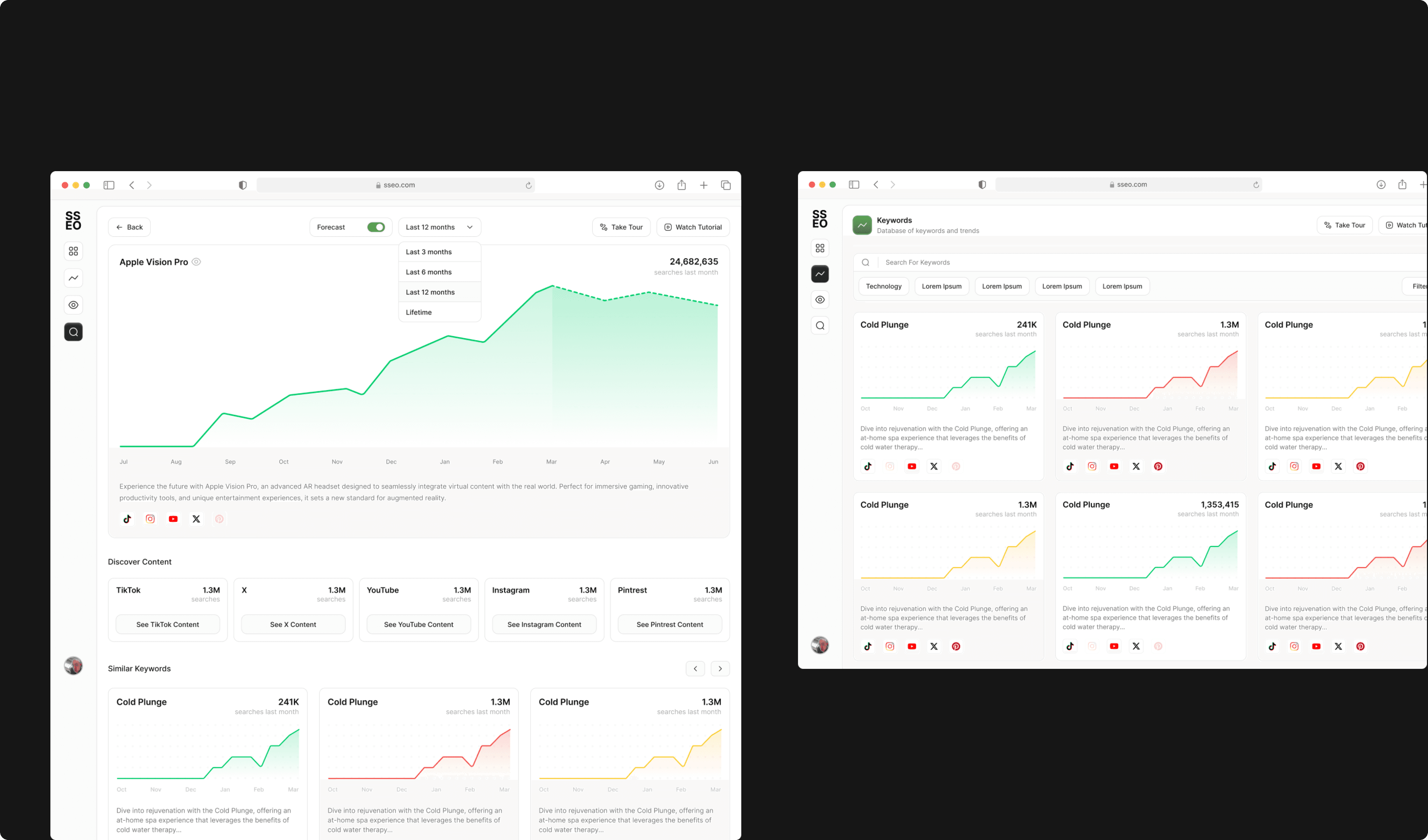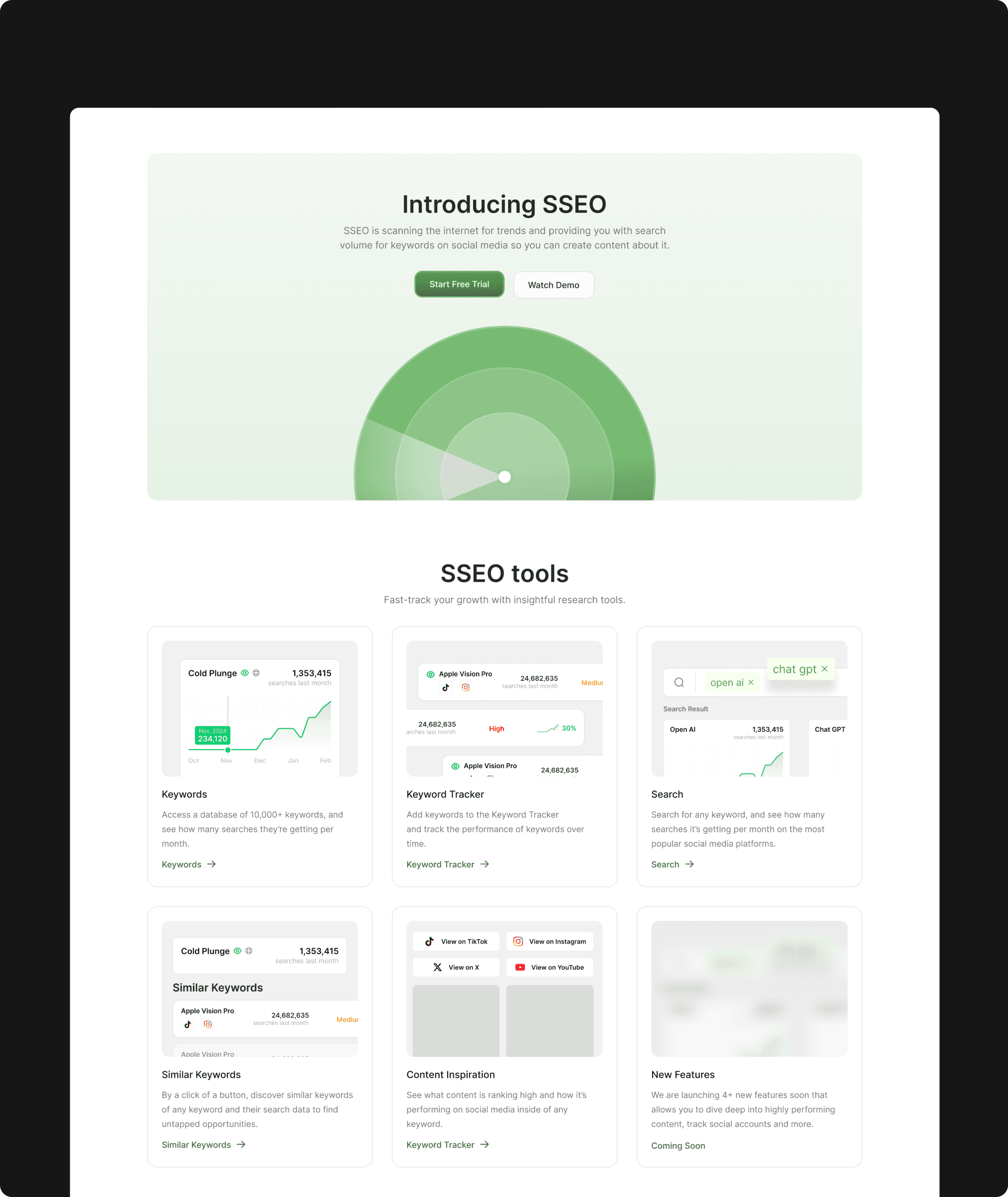 SSEO is a comprehensive social media optimization platform that provides creators and businesses with powerful keyword intelligence across major social platforms. It analyzes search volume trends, identifies trending keywords, and delivers actionable insights to help users maximize their content reach and engagement. The platform transforms social media strategy from guesswork into data-driven decision making.